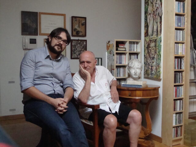 Qui nella foto siamo nel 2010. Un Marione d’antan e il maestro siedono nella casa milanese di quest’ultimo, in una delle varie occasioni che ci ha visti insieme, immersi in partiture, carte, cataloghi, storie e aneddoti, per la stesura del mio saggio Teatri Nascosti: gesto, segno e drammaturgia nell’opera di Sylvano Bussotti. Un testo pubblicato poi nel 2013 e che ancora oggi penso sia l’opera più completa che esista sul Maestro (ed è per questo che l’ho scritto, proprio per la difficoltà sempre avuta nel trovare informazioni unitarie su di lui).